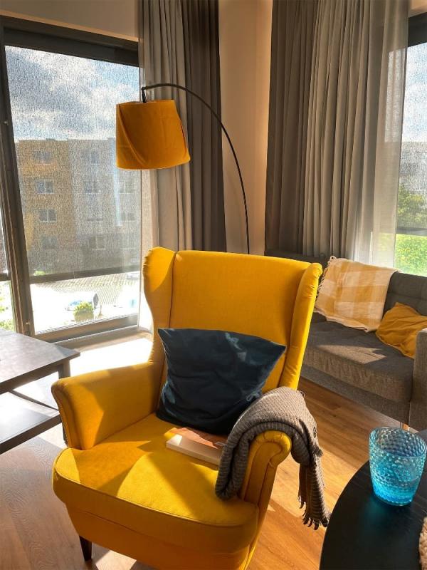 Screenové rolety v obývacím pokoji se žlutým křeslem