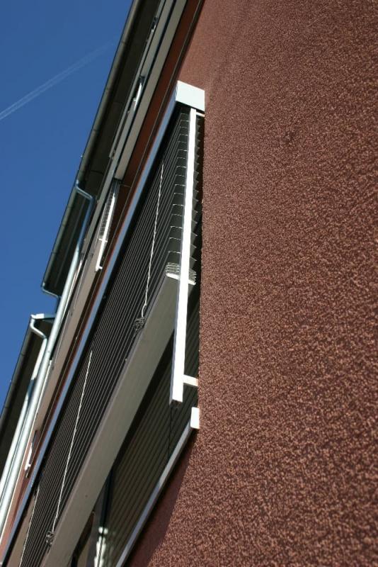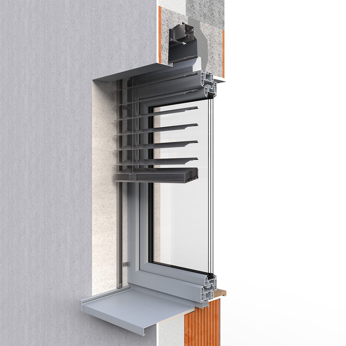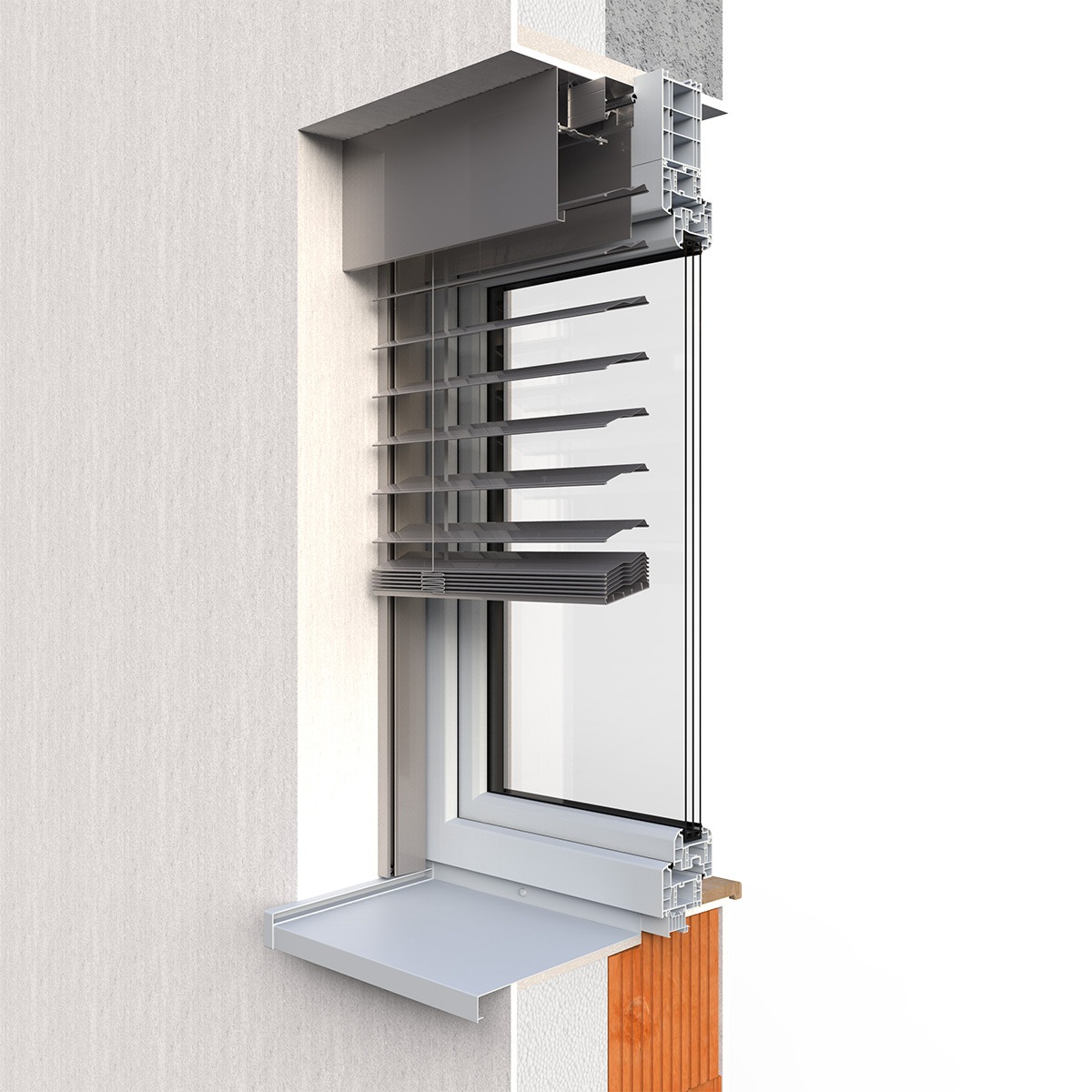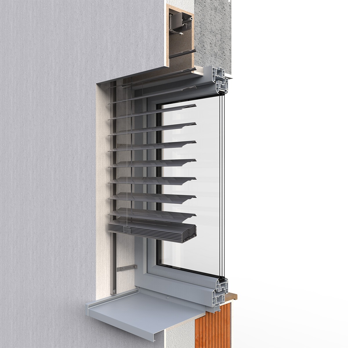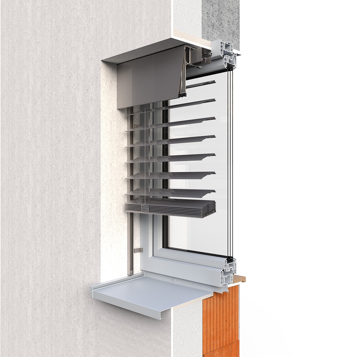 Lamelový nábal i hřídel s motorem jsou skryty v dutině speciálního stavebního překladu, takže po dokončení fasády nebude vytažená žaluzie vidět. Toto řešení je elegantní a čisté, ale je nutné s ním počítat již při projektování a výstavbě.
